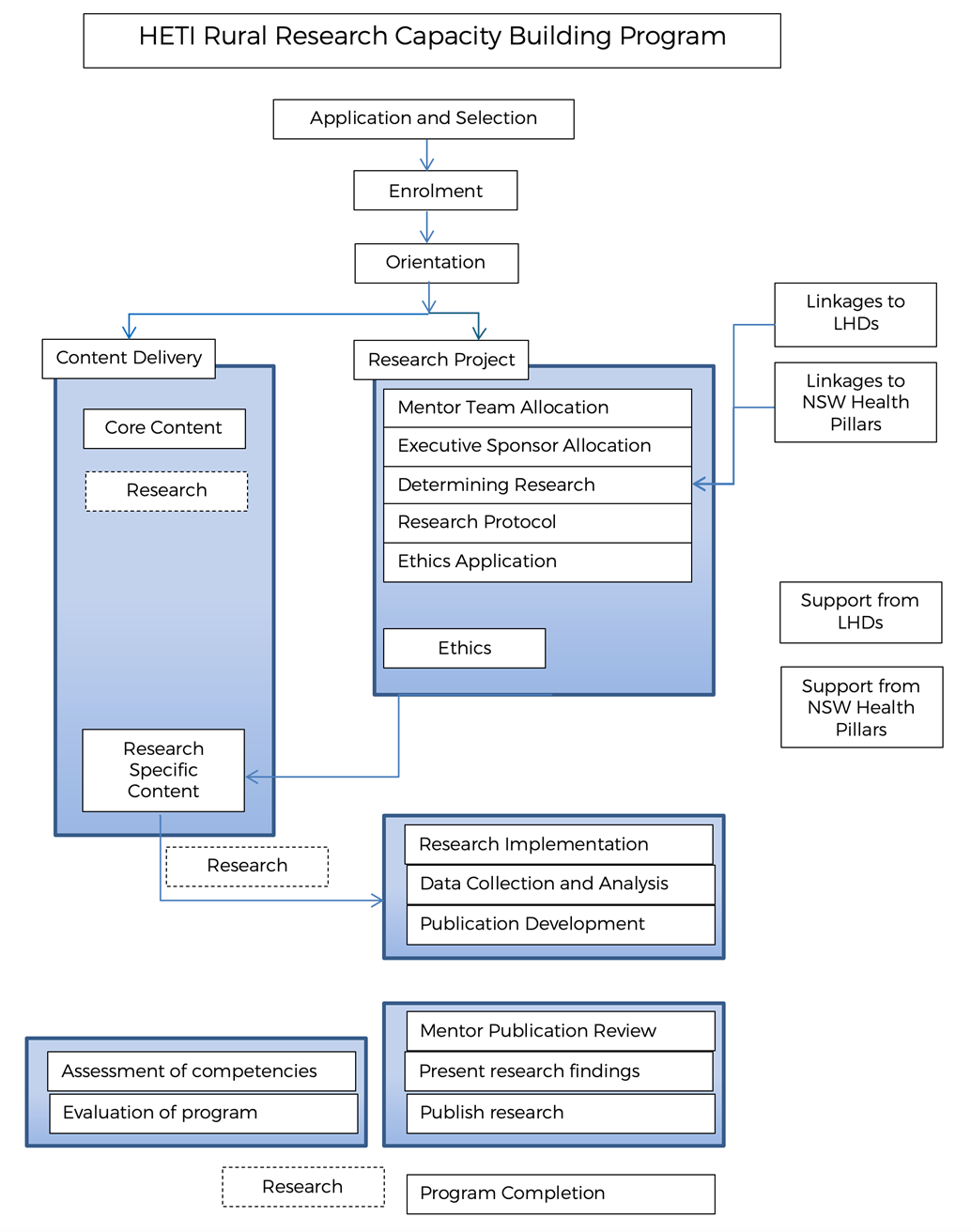 The aim of the Rural Research Capacity Building Program (RRCBP) is to guide development of research and evaluation skills of experienced health workers who are novice researchers, while simultaneously contributing to the rural health research evidence base. Candidates of the program work within the public health sector in public health executive, hospital, community, aged care or domiciliary settings. Health District executive sponsors provide input into the selection process for candidates. On average a cohort of 18 candidates (range 13–26) are accepted into the two-year program, with intakes held every 12–18 months. As a result, cohorts overlap by 6–12 months and more than one cohort is underway the majority of the time.