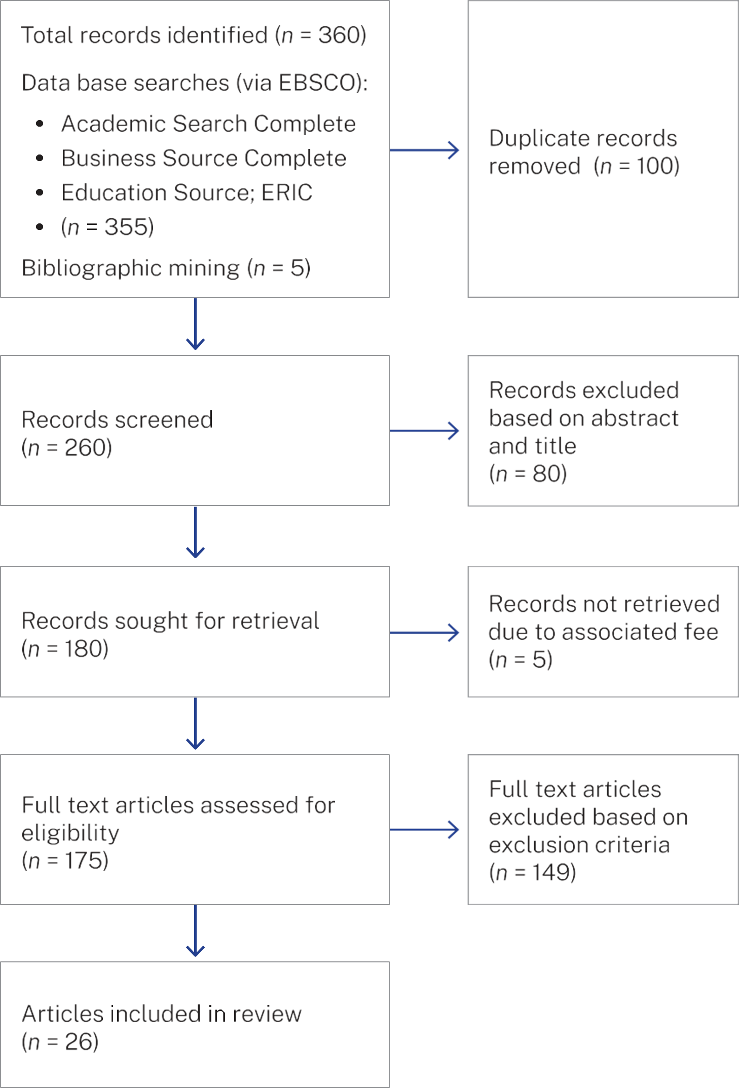 An extensive title and/or abstract search of the following databases: Academic Search Complete, Business Source Complete, Education Source and ERIC (via EBSCO) was conducted in December 2023 and January 2024. Individualised search strategies were developed according to the indexing terms and search syntax of each database, including Boolean operators and truncations. Manual searches of related articles and other papers citing included references, as well as bibliographic mining were conducted.